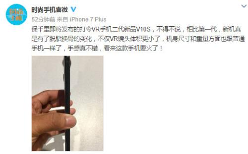 即将推出的二代新品V10S真如该微博所言,彻底解决了VR手机便携性不高这一难题,那么凭借VR全景拍摄这一颠覆式的创新功能,相信消费者对VR手机的接受程度必然会大大提高,正如该微博所说,这款VR手机有望成为2017年的爆款产品!