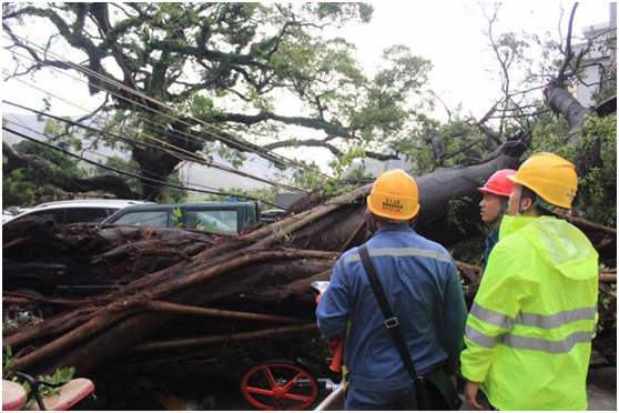 8月23日 15:00广东电网珠海香洲供电局横琴供电所辖区因大树刮倒引起低压架空线路街码脱落情况,横琴所工作人员赶往现场,制定抢修方案。 广东电网 麦活文 摄