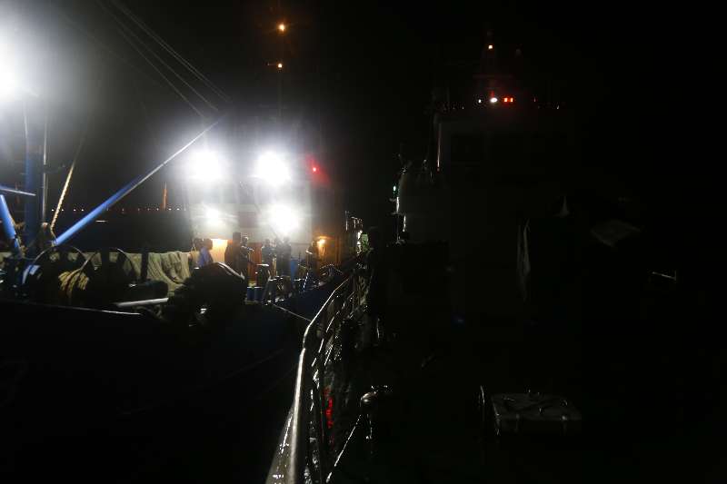 人民网北京9月5日电 4日晚19时许,上海海警支队接到报警,沪崇渔13063渔船在海上作业时,一名船员不慎被拉网绳崩伤面部,流血不止。该支队立即启动海上救助应急预案,派出海警31018艇前往救援。在赶往事发海域期间,海警官兵与报警船保持不间断联系,指导船员利用船上衣物进行先期止血包扎。渔船向海警报告,伤员几近昏厥,伤情严重,时间就是生命,晚一分钟到场伤者就多一分危险,该艇始终保持最高速度向事发海域开进。由于长江口海域渔网较多,海况复杂,加上夜间能见度较低,为保证航速不降,全体艇员高度警惕,加强航行瞭望。23时许,疾驶近4个小时后,在鸡骨礁海域,发现报警船,海警执法艇努力克服涌浪影响,果断靠帮并迅速将伤者转到艇上。伤者被转移至艇会议室后,船上军医对伤者伤情进行了进一步检查,在涌浪汹涌,船艇左右摇摆均达到30度的情况下,开展检查其难度无异于钢索上跳芭蕾,军医不但冷静沉着而且技术精湛,成功地为伤者止血、消毒、包扎。