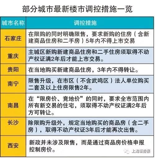 梳理各地限售政策:石家庄在限购的同时明确,新购住房(含二手房)五年内不得上市交易;重庆方面,主城区新购新建商品住房和二手住房须取得不动产权证满两年后才能上市交易;贵阳规定,在当地购买新建商品住房,三年内不得转让;南宁则是限售升级,在市区(不含武鸣区)法人单位购买二套及以上住房限售两年;南昌要求,全市范围内所有新交易的住宅,须取得不动产权证满两年后方可转让;长沙除限购升级外,规定当地购买的商品房(含二手房),取得不动产权证三年后才能再次出售。