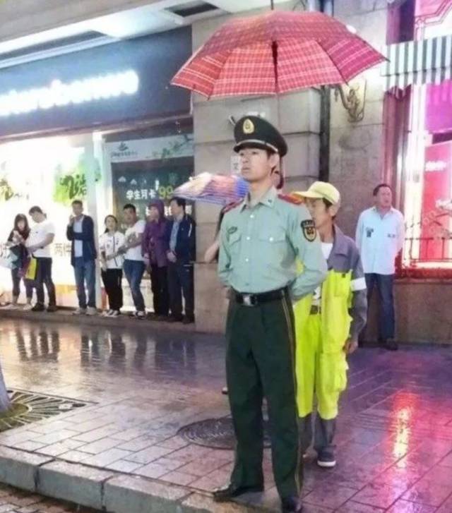 还有在下雨天为执勤士兵撑伞,