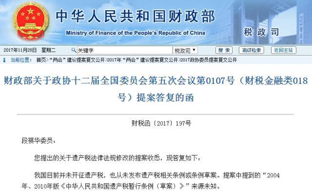 10月17日,财政部在其网站公布《财政部关于政协十二届全国委员会第五次会议第0107号(财税金融类018号)提案答复的函》。该函回答了全国政协委员段祺华关于遗产税法律法规修改的提案的相关问题。