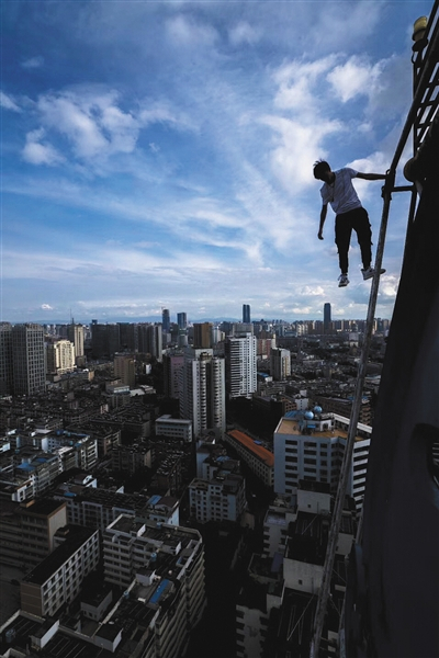 爬楼与刺激的体验感“永宁外号叫玩命,跟他一起爬楼发现是真的在玩命。”阿明是一名资深爬楼党,今年9月21日,他、吴永宁、童虎三人相约爬上了武汉某座高楼,阿明为永宁拍了一套写真,照片中,永宁未做任何防护措施,神情轻松地躺在高楼顶端的避雷针装饰塔架横梁上。