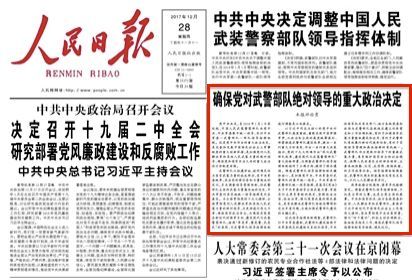 今天出版的《人民日报》头版上有一篇重要评论:《确保党对武警部队绝对领导的重大政治决定》,其中提到:武警部队从组建伊始,就明确定性为国家武装力量的组成部分,受中央军委统率,其后因形势任务和力量构成的变化,多次调整领导管理体制,但武警部队主体的武装力量属性始终没变,中央军委对其实施统一领导指挥是内在要求。