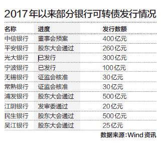 另据第一财经记者统计发现,可转债成银行“补血”新宠。截至2017年12月25日,A股上市银行中待发的可转债规模高达1765亿元。而过去十年中,仅有中国银行、工商银行和民生银行发行过可转债,合计850亿元。