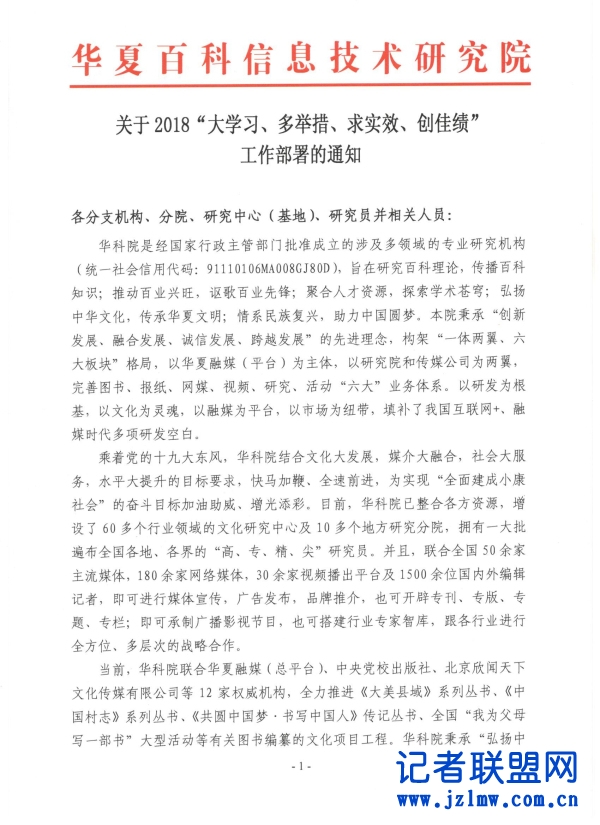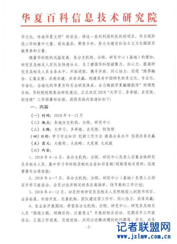 2018年4月10日,华夏百科信息研究院下发了《关于2018“大学习、多举措、求实效、创佳绩”工作部署的通知》,标志着2018“大学习、多举措、求实效、创佳绩”全面启动。