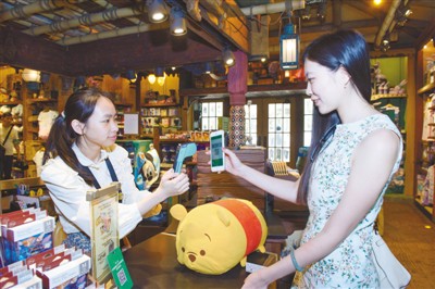 5月24日,香港迪士尼乐园度假区与微信支付达成企业联盟合作,游客从即日起在香港迪士尼乐园可以使用微信支付。图为游客体验用微信支付购买纪念品。