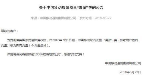 中国移动22日在官网发布关于取消流量“漫游”费的公告,公告称,自2018年7月1日起,中国移动取消流量“漫游”费,新老用户省内流量升级为国内流量(不含港澳台)。