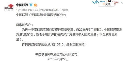 继中国移动之后,中国联通也于同日通过官方微博宣布:自2018年7月1日起,中国联通取消流量“漫游”费,新老手机用户的省内通用流量升级为国内流量(不含港澳台流量)。