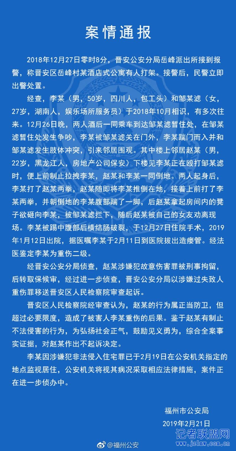 今天凌晨1时24分福州公安发布通报,披露案情细节的同时也明确表示,福州市晋安区人民检察院经审查认为,赵某的行为属正当防卫,但超过必要限度,造成了被害人李某重伤的后果。“鉴于赵某有制止不法侵害的行为,为弘扬社会正气,鼓励见义勇为,综合全案事实证据,对赵某作出不起诉决定。”