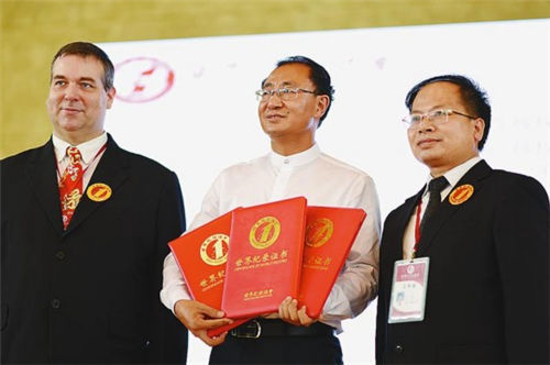 8月7日,在西安培华学院篮球馆,徐长清接受来自世界纪录协会高级认证官大卫·威廉和张健2位先生颁发的三项世界纪录证书。