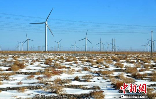 资料图:”大雪“过后,祁连山脉戈壁滩冬雪风机相映成景。万宗平 摄