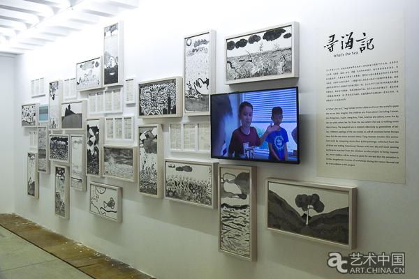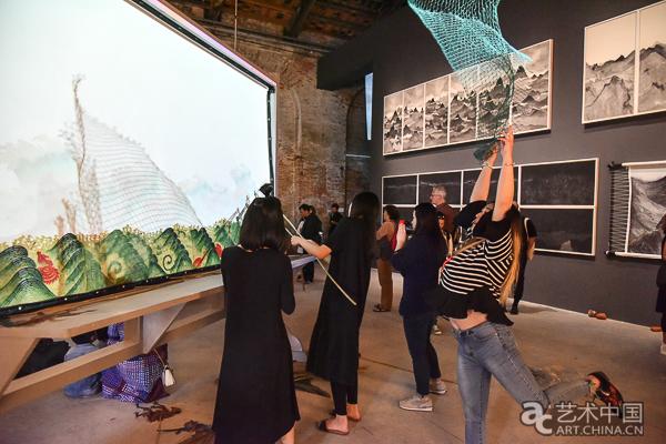除了借用当代手法来传承传统艺术,中国馆的大量展品也正视了“时间”和“相对文化”对于艺术的磨砺。作为一个艺术思想与欧美主流艺术思想差异较大的国家,中国馆的展品并没有费劲帮助外国人去理解作品,而是邀请外国文化流入作品之中。艺术材料取材于世界各地,在汤南南的《寻海记》中也邀请世界各地的小朋友画他们想象中的大海,最后将这些作品汇集在一起,成为一个海纳百川的影像作品。在中国馆的工作坊中,也邀请前来参观的观众们使用水墨来画海,从而进一步延长这个关于追寻海洋的艺术动画。
