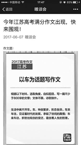 6月7日中午,全国高考语文考试科目结束,各地高考语文作文题目随之在网络上刷屏,据央视新闻微博消息,江苏省的作文题目是“以车为话题写作文”。