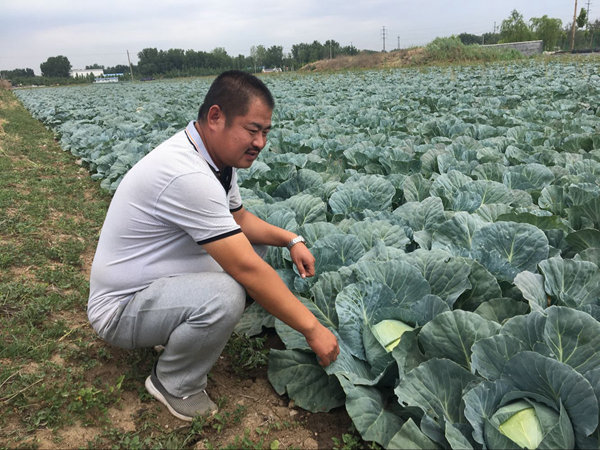 安丘市新安街道办焦家庄农户于海洋查看田里的蔬菜