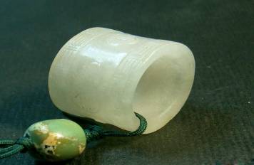 玉扳指又叫玉谍(音同射),本意是拉弓射箭时扣弦用的一种工具,套在射手右手拇指上,以保护射手右拇指不被弓弦勒伤的专用器物。后来引申为能够决断事务,具有身份和能力的象征。