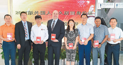 图为在北京市公安局出入境管理局中关村外国人服务大厅,首批获得2017版外国人永久居留身份证的外籍人士合影。