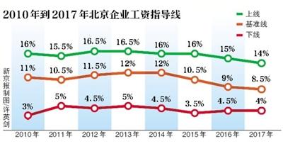 昨日,北京市人社局发布了2017年北京企业工资指导线,职工平均工资增长的基准线为8.5%,上线为14%,下线为4%,各企业均可参照指导线调整职工工资水平。记者获悉,这是北京自2014年以来,连续第4年下调工资增长基准线标准。