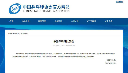 6月29日下午,中国乒乓球协会在官网发布公告,宣布中国乒乓球男队将不参加国际乒联职业巡回赛澳大利亚公开赛,原文如下:鉴于目前男队主要运动员连续参赛带来的身体过度疲劳,加之伤病困扰,不具备参赛的竞技状态。中国乒乓球队研究决定,男队将不参加国际乒联职业巡回赛澳大利亚公开赛,进行必要休息调整。女队按计划正常参赛。中国乒协已就此事与国际乒联进行过沟通,并得到理解。