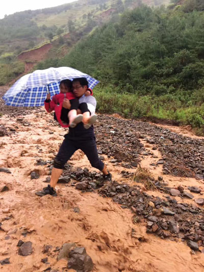 尽管那天下着大雨,可学生们还是步行五六公里到学校上课。一如既往站在学校门口迎接学生的段瑞,发现离学校不远处的河滩河水暴涨,几个已经走到河滩中间的孩子,弱小的身躯被湍急的河水困在碎石堆上。