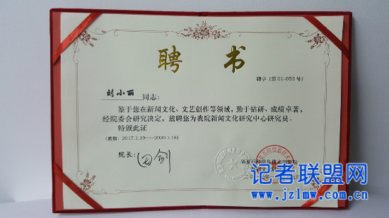 付出终有收获。2017年春节前夕,首都北京,火树银花。华夏百科信息研究院经过认真研究、民主推荐、严格考核、集体通过等相关程序,正式聘任刘小丽为该院新闻文化研究中心的研究员。当田剑院长一行亲赴山西曲沃,给小丽带去新春的慰问和祝福,并亲手将鲜红的聘书捧到她手上时,小丽感慨万千、倍受鼓舞。