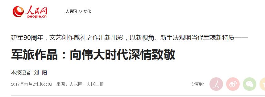 今天,人民日报发表了《军旅作品:向伟大时代深情致敬》一文。肯定了《建军大业》以新视角、新手法向观照当代军魂新特质。文中提到:为主旋律正名,为军旅题材正名,为青年演员正名。《建军大业》表现的,不仅是一段革命的历史、军队的历史,更是一个民族昂扬向上、自强不息的精神在一代又一代人中的薪火相传。
