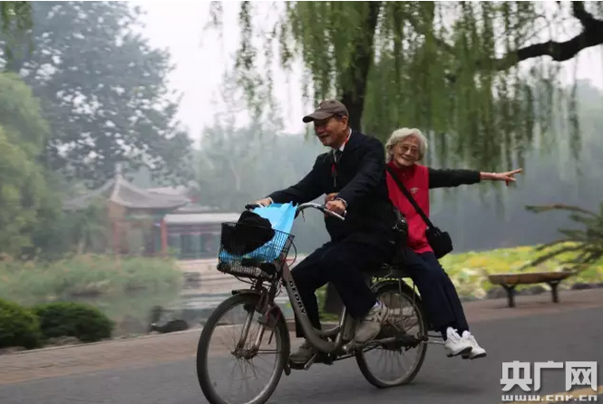 潘际銮与妻子李世豫在清华园骑行