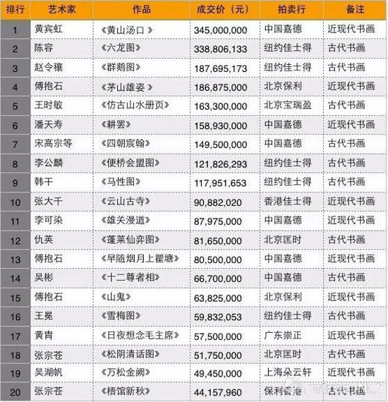 据分析,今年中国书画部分的成交量和成交总额分别是34000余件和106.15亿元。在TOP20中,中国古代书画占据了11个席位,近现代书画占据了9个席位,其中亿元级别中古代书画则是6个席位,近现代书画仅有3个席位。年初纽约佳士得的藤田美术馆旧藏专拍占据了其中的5个席位,其他的15个席位被中国嘉德、北京保利、北京宝瑞盈、北京匡时、上海朵云轩以及广东崇正等拍卖公司所占据。