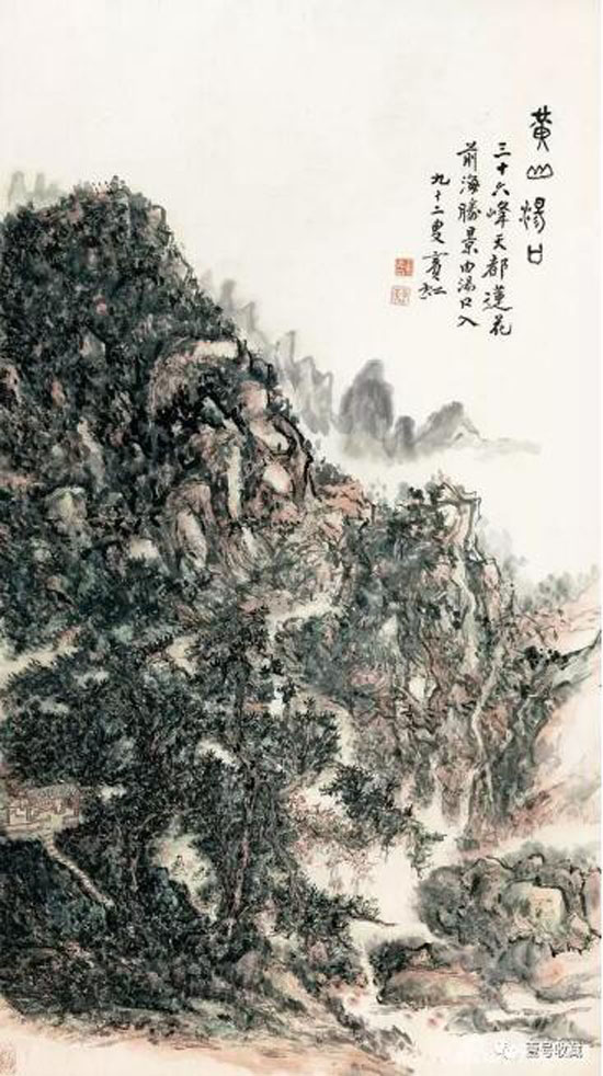 款识:黄山汤口。三十六峰、天都莲花、前海胜景由汤口入。九十二叟宾虹。