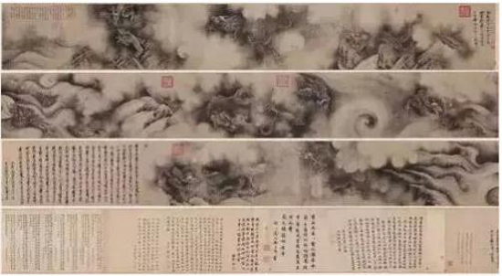 在这幅传世佳作中,共钤有50余方印章以及题字。其中,画家陈容本人自题古诗一首,且在文尾处留下了“所翁”一印,是为陈容号。乾隆皇帝则是毫不掩饰对于这幅《六龙图》的喜爱,依照自己的口味,在画正中央留下御题行书。
