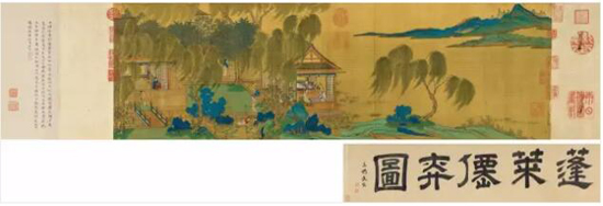 明代名家仇英所作工笔画《蓬莱仙奕图》。画作用色鲜明,笔触细腻,描绘众仙聚首下棋的情境。此作具有“十洲仇英摹”款识,钤印“十洲”。《蓬莱仙奕图》以重彩青绿写成,明代画家文征明上题,此幅作品为仇英30岁之前为吴文定公所作,由梁清标以及清内府收藏,在《石渠宝笈三编》中有著录。有乾隆、嘉庆、宣统鉴藏。