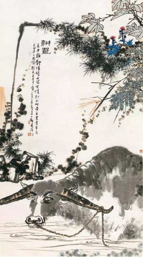 《耕罢》作于整张八尺宣纸之上,绘高石花丛掩映下,一水牛于水中静卧。石的描绘占据了画面将近三分之二的面积,乃潘天寿典型的“潘公石”样式,笔力雄健,搭建出画面的整体结构。整幅画沉雄阔大,生机勃勃,给予观者极强的视觉震撼,汇集了画家诸多经典语汇,堪为画家巅峰巨制。
