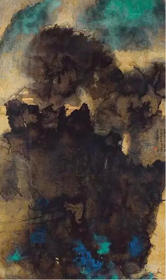 《云山古寺》创作于1965年,不仅是张大千泼墨时期的巅峰之作,也是他本人的得意之作,与同宋元时期的“云山派”名家比较,并称其作品为“自开法门”。中国历代就有以泼墨和染墨技法描绘云山的先例,该作题识中提到的元章父子(米芾、米友仁),房山(高克恭)与方壶(方从义)皆为其代表。
