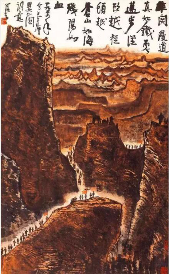 1935年,红军收复遵义,毛泽东为此写下著名的《忆秦娥·娄山关》,李可染据此创作了《雄关漫道》,也成为李可染山水画创作巅峰状态中的代表作,也是中国嘉德2015年秋拍以1.84亿元释出的《万山红遍》的姊妹作。