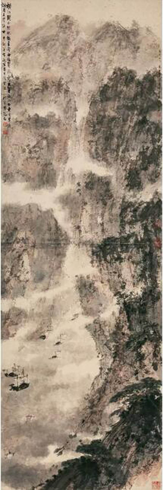 1944年,傅抱石入蜀已经五年有余,回想起数年来颠沛流离的生活,时常不禁感慨万千。巴山蜀水之间,他似乎格外想念家乡,反复吟咏吕潜《江望》,内心受到无限触动。于是,他挥起画笔,频频以诗意形诸画面,抒发了惆怅的思乡之情。仲秋的一天,傅抱石又殚精竭虑,再次创作完成大幅《早随烟月上瞿塘》,题识:“横江阁外数帆樯,立尽西风鬓渐霜。只有乡心不东去,早随烟月上瞿塘。甲申秋八月写遂宁吕半隐望江,新喻傅抱石”;钤印:傅(朱文方印)抱石私印(白文方印)抱石得心之作(朱文方印)代山川而言也(朱文方印)踪迹大化(朱文方印)。