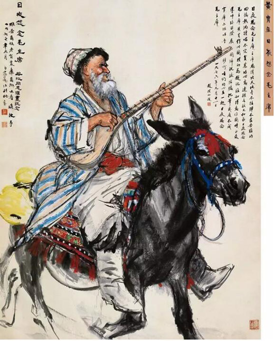 此幅《日夜想念毛主席》创作于1976年9月毛主席弥留之际,约24.6平尺,画面描绘的是库尔班大叔骑著毛驴,弹著冬不拉,唱著赞歌,迎著朝阳向东方走去。毛主席去世两天后的9月11日,赵朴初在上面题写了自作诗。