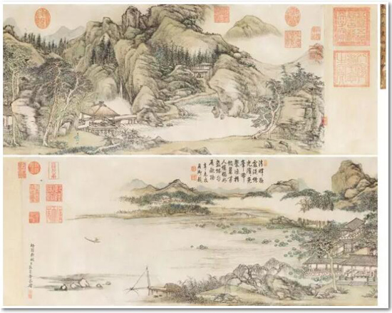 该作曾著录于《石渠宝笈续编》重华宫藏,上面印有乾隆题跋,张宗苍本人并没有落年款。1759年,张宗苍去世的三年后,乾隆才著人装裱此画并在画上题诗,间有追思之意。