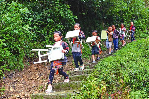 9月5日,久甲小学的学生在搬运爱心单位送来的新课桌凳。