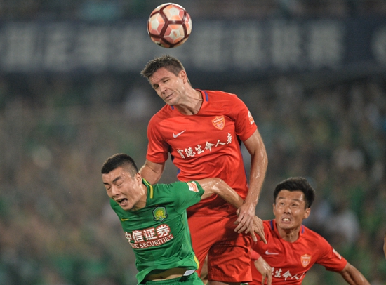 中超联赛第24轮,积分垫底的延边富德队客场4∶4逼平北京中赫国安。图为延边富德外援古兹米奇与国安后卫李磊争抢头球。视觉中国供图