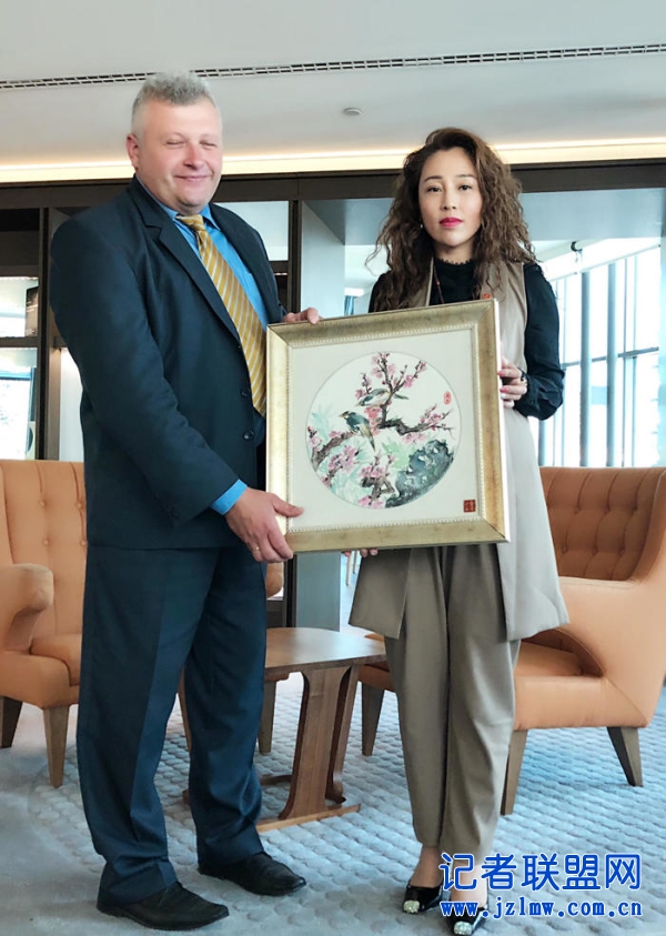 图为:塞尔维亚共和国农业部部长、国务院常委热列克先生与2017年环球夫人全球总冠军邹红平女士合影留念,并赠送中国彩金沙画创始人王金亭老师作品赠送给塞方领导人收藏。