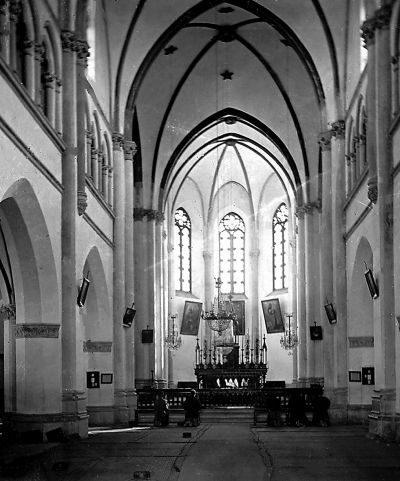 1871年约翰·汤姆逊在游览北京期间拍摄的1866年重建落成的蚕池口教堂内景。
