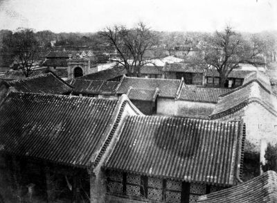 1860年至1864年之间,从蚕池口教堂原址南侧的屋顶上向南偏东拍摄,可见原教堂区域入口大门。