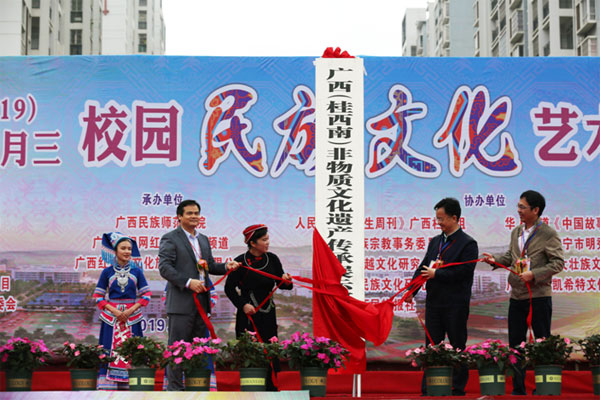 学校在自治区文化和旅游厅、崇左市政府的指导下建立了广西(桂西南)非物质文化遗产传承展示研究基地,并于此次开幕式上举行了揭牌仪式。现场还请来了壮锦、壮族高腔山歌、花山拳等非物质文化遗产项目的传承人到现场进行龙州壮锦制作技艺、大新高腔诗蕾、宁明花山壮拳等崇左本地特有的壮族非物质文化遗产项目表演。
