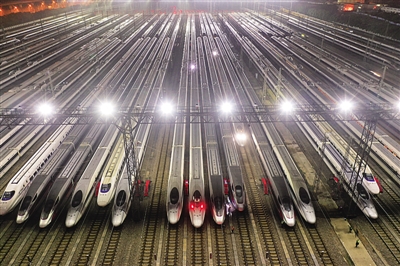 1月10日凌晨,停靠在武汉动车段的动车组列车蓄势待发。彭琦摄/光明图片