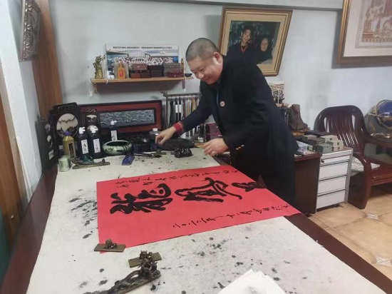中国政策网总编辑、著名书法家张华夏正现场为著名社会活动家李法明创作书法精品