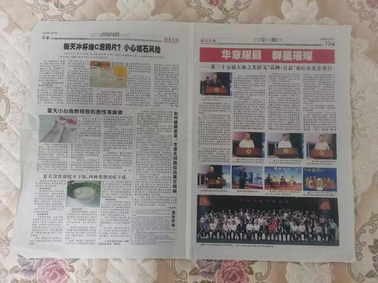 著名品牌战略策划专家、中国政策网总编辑张华夏赠送给著名社会活动家李法明的刊登由他本人于2023年6月20日在北京万寿宾馆出席并讲话国家大型论坛仪式的《健康导报》样报